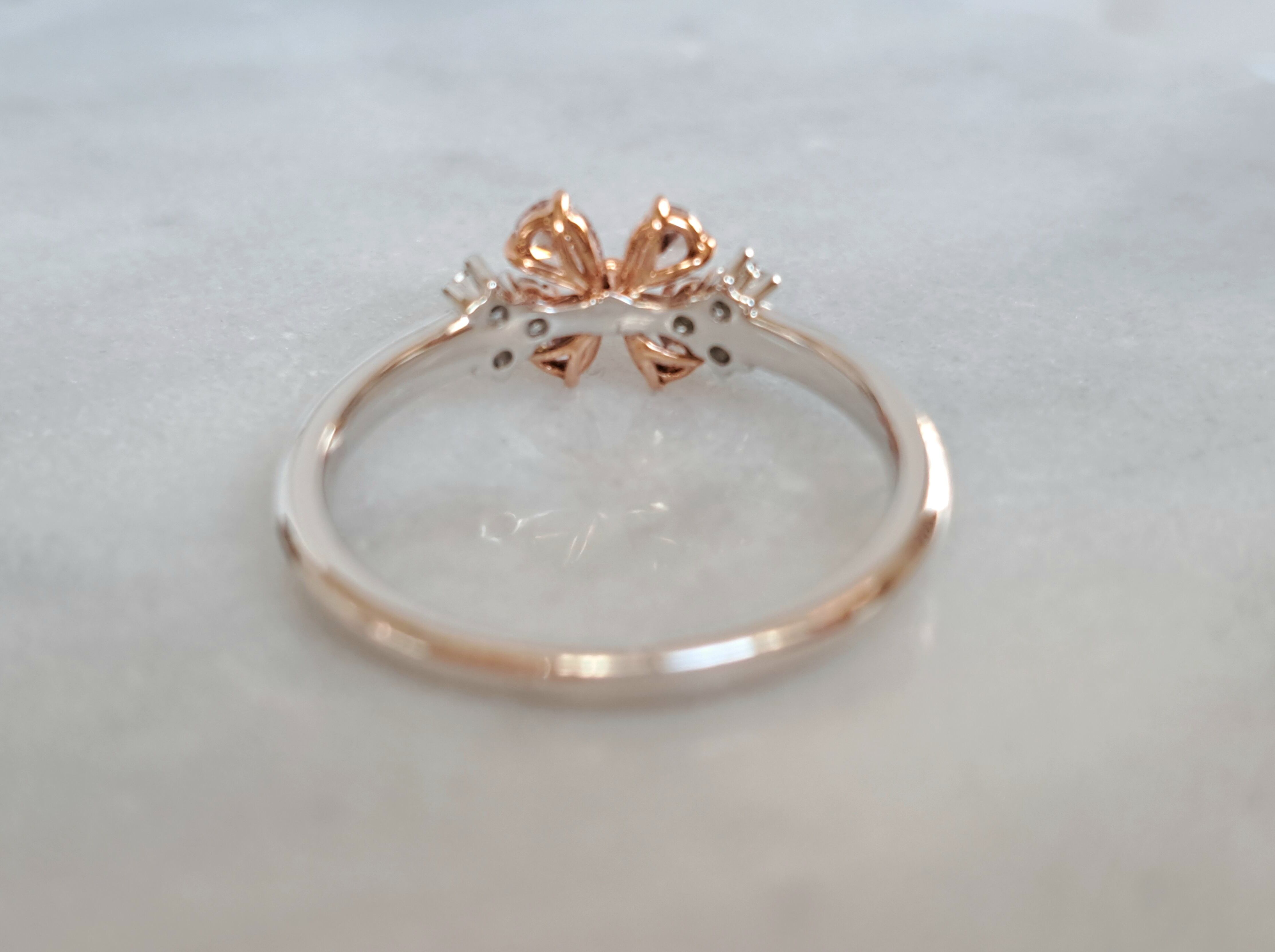 クラリティはSI2メイン&一石I1ですが、全石カーボン皆無、拡大で気になる傷もありません。クリアな透明感に満ちています。サイドにあしらったカラーレスのメレもVS~SI程度、クリアで上質。ピンクのお花のサイドにカラーレスメレの3石がどことなく横置きハートのようにも見え?ますます愛らしい。