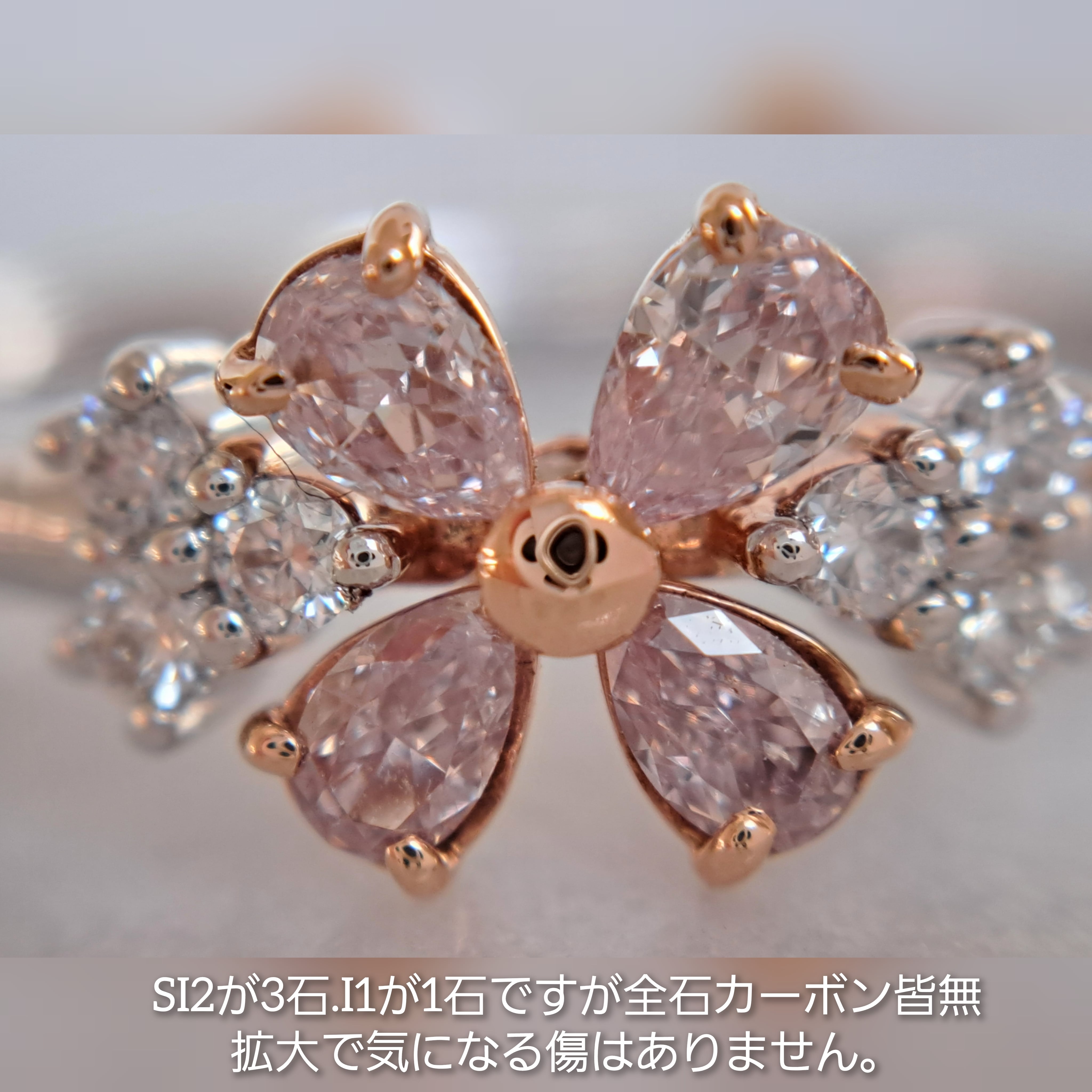 個人的に今回オススメの逸品です。まずピンクダイヤ4石計0.251ctのボリュームは勿論ですが、ピンクダイヤモンド全石が綺麗。