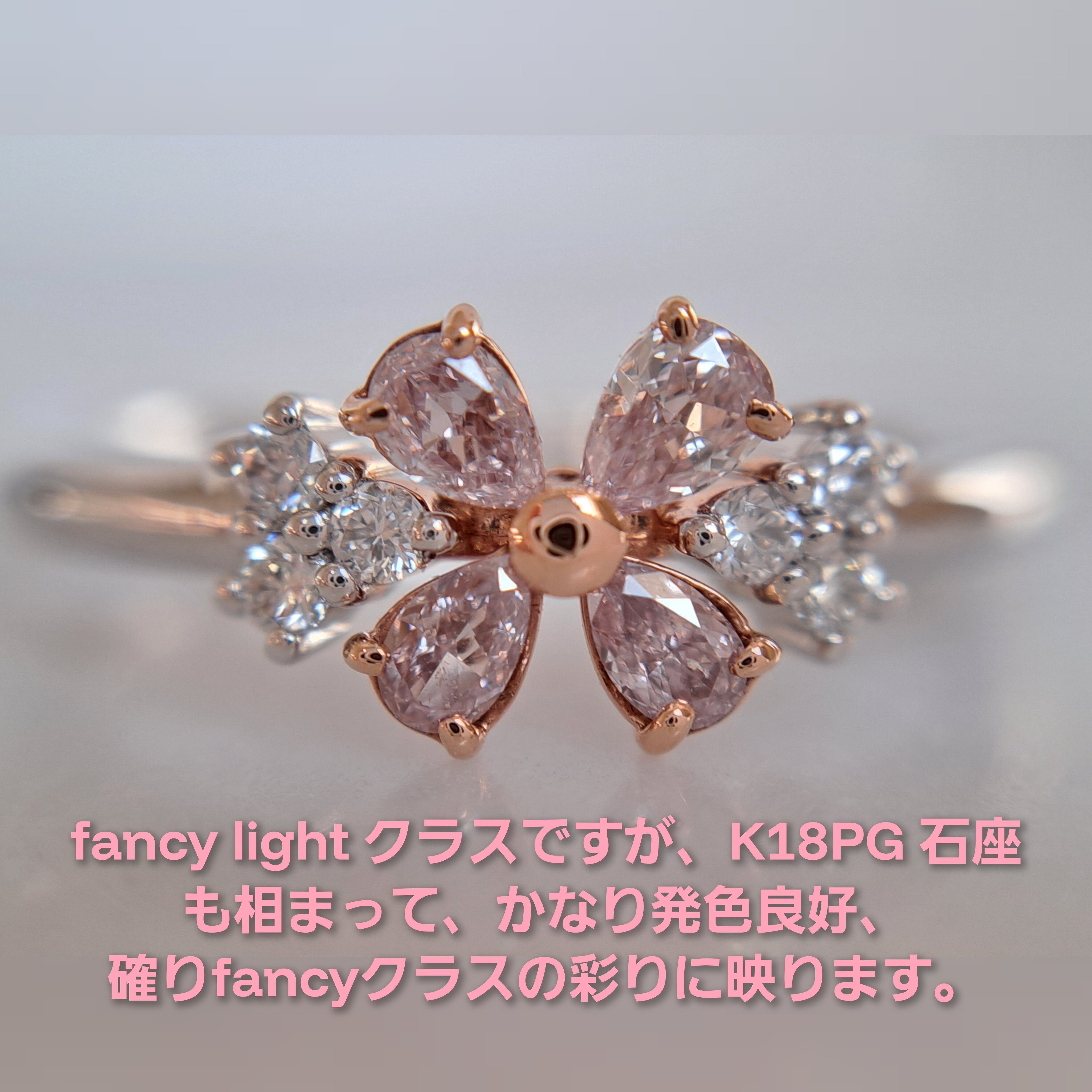fancy light クラスですが、ピンク石座部分がK18PGなことも功を奏し、ピンクの発色がひじょうに良好で私見、確りとfancyクラスの彩りに見えます。