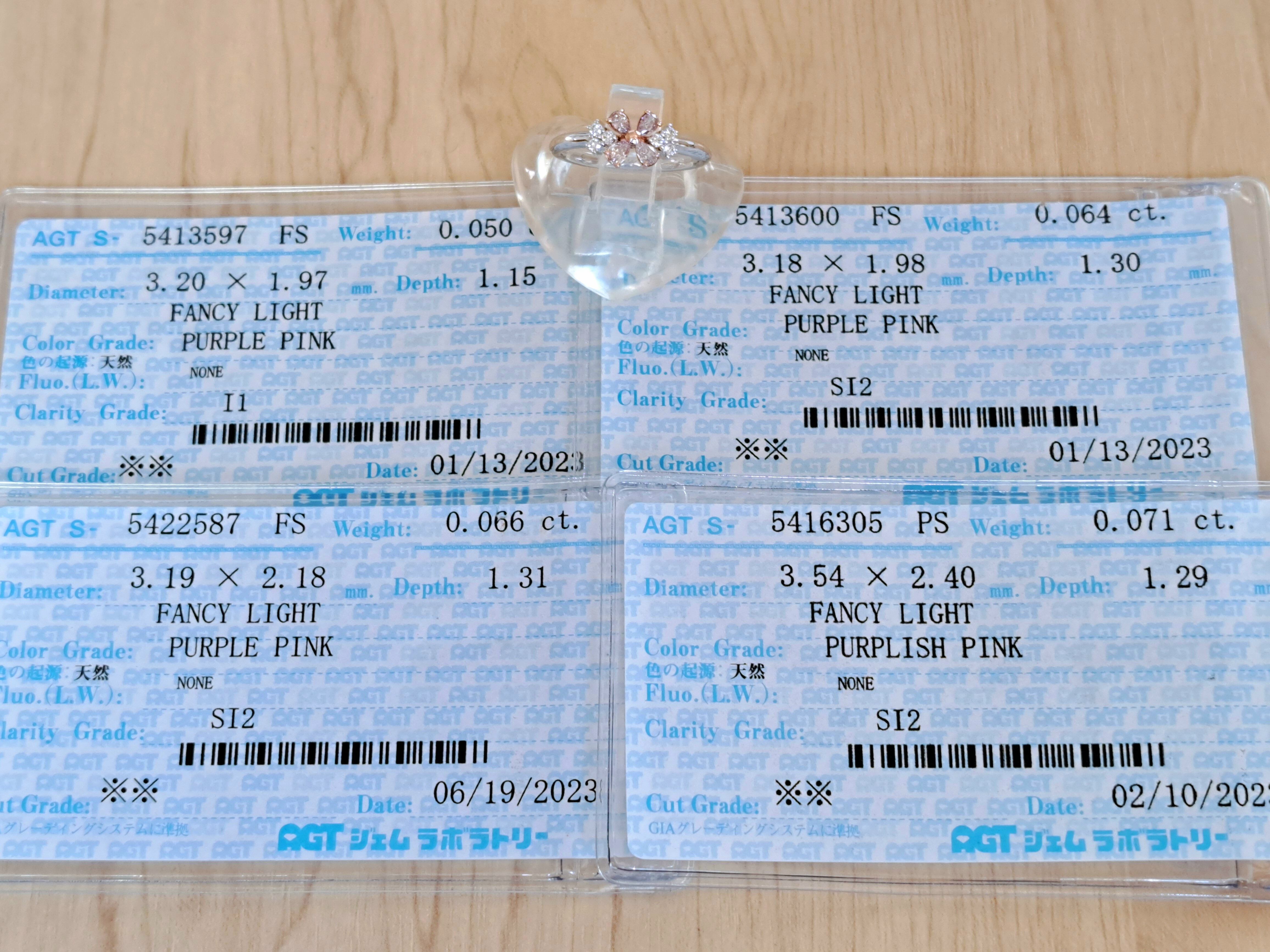 fancy light purple pinkが3石、fancy light purplish pinkが1石ですが、4石とも色差の違和感は全くありません。パープルピンクメインのため、色味は全体的に紫強め、断定できませんがおそらく推定ロシア産ピンク。(ロシアのピンクはややしっとりとした落ち着いた彩が特徴)